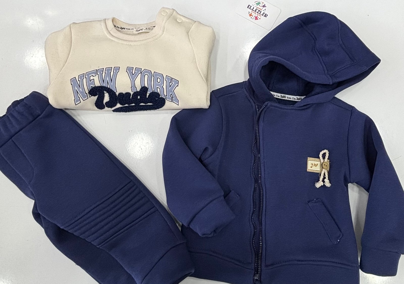 Şehirli miniklerin tarzına modern bir dokunuş! Ellezler Çocuk Giyim koleksiyonunun bu fonksiyonel üçlü seti; lacivert kapüşonlu hırkası, üzerinde dikkat çekici kabartma detaylı “New York Dudes” yazısı bulunan sweatshirtü ve uyumlu alt eşofmanıyla tam bir stil ve konfor paketi sunuyor. Hem okulda hem de hafta sonu gezilerinde çocuğunuzun dinamik enerjisine eşlik edecek bu kombin, katmanlı giyim avantajıyla her mevsim kullanım kolaylığı sağlar.