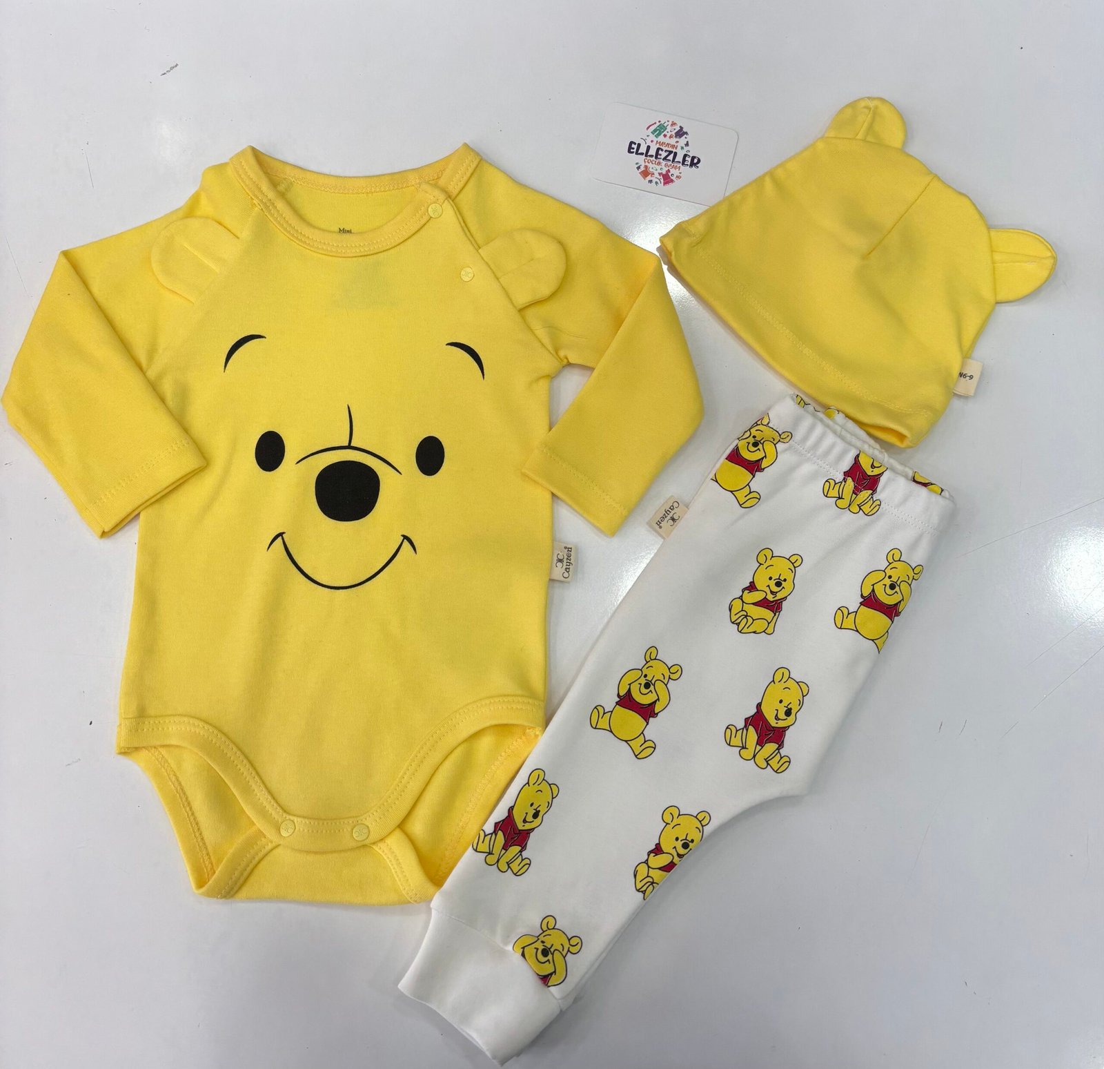 Bebeklerin dünyasına neşe katan bir dokunuş! Ellezler Çocuk Giyim koleksiyonunun en sevilen parçalarından biri olan bu sarı renkli Winnie the Pooh temalı set, hem sevimliliği hem de fonksiyonelliği bir arada sunuyor. Set içerisinde yer alan kulak detaylı body, karakter baskılı pantolon ve uyumlu bebek şapkasıyla bebeğiniz tepeden tırnağa bir masal kahramanına dönüşecek.