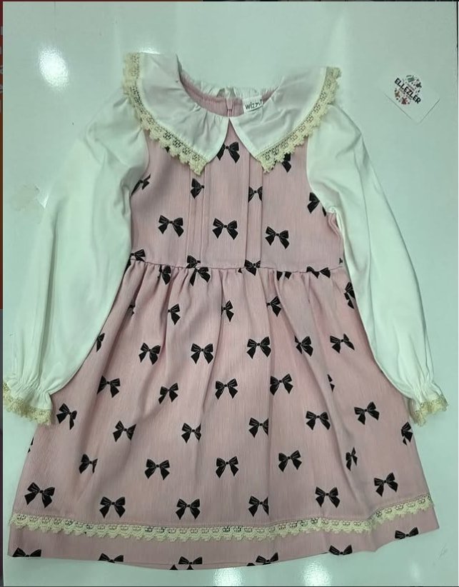 Küçük hanımların şıklığına zarafet katacak bir tasarım! Ellezler Çocuk Giyim kalitesiyle sunulan bu pembe elbise, üzerindeki siyah fiyonk desenleri ve nostaljik dantel yaka detayıyla zamansız bir tarz sunuyor. Özel günlerden doğum günü partilerine kadar her anı unutulmaz kılmak için ideal bir seçim.